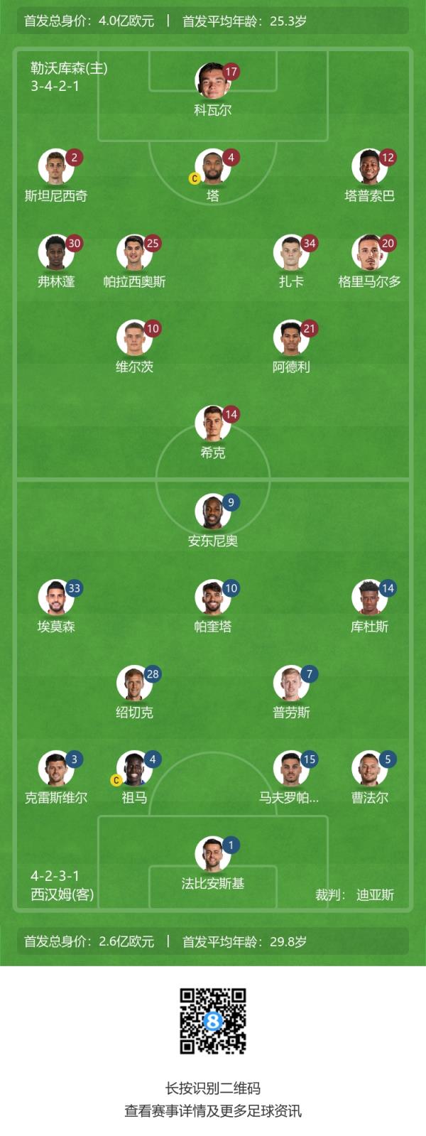 西汉姆首发:1-法比安斯基、4-祖马、15-马夫罗帕诺斯、5-曹法尔、3-克雷斯维尔、28-绍切克、7-沃德-普劳斯、33-埃莫森、14-库杜斯、10-帕奎塔、9-安东尼奥